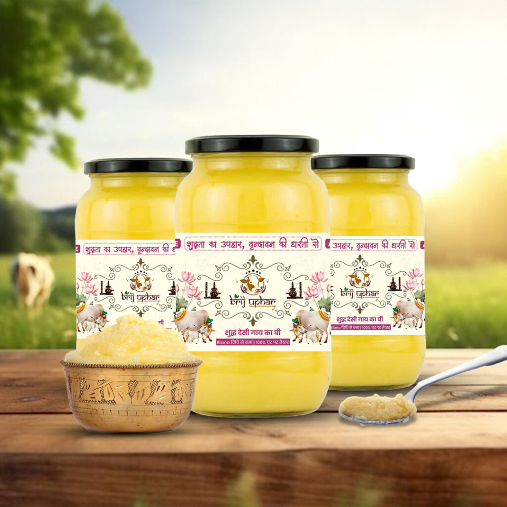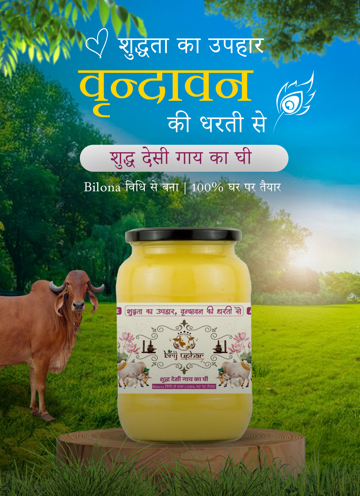 Brij Uphar is pure, handmade desi ghee prepared in Vrindavan using traditional methods. It is crafted without any machines or chemicals, ensuring authentic taste and unmatched purity.